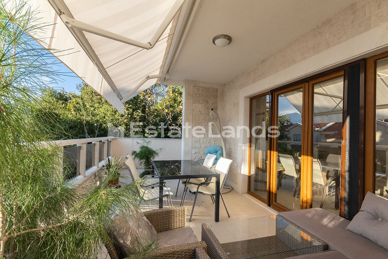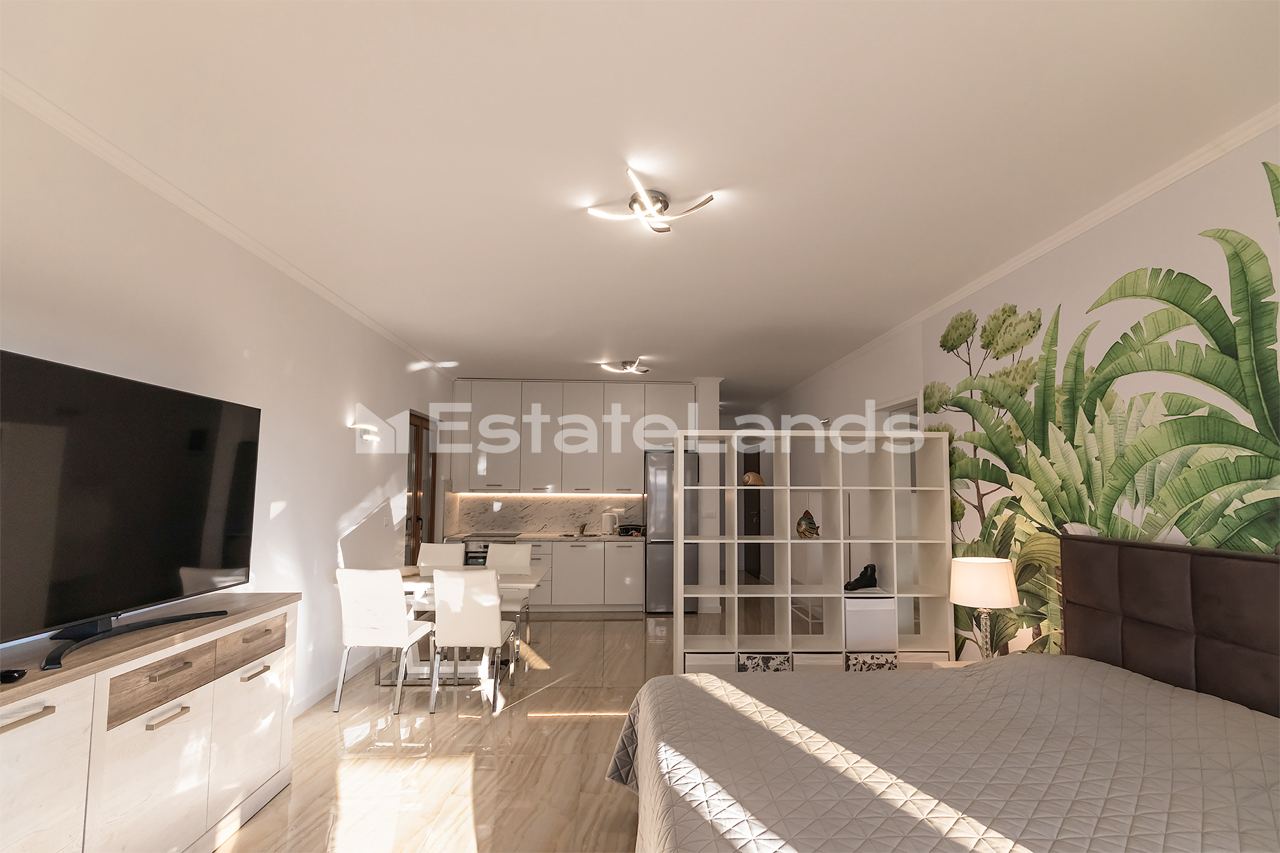 For sale spacious and cozy studio apartment just 200 meters from the sea. The apartment is fully equipped with quality furniture and all necessary appliances from dishwasher to clothes dryer. Spacious terrace and main windows to the south-west, partial sea view. Perfect for living and renting. Open plan - can be easily transformed into a studio apartment. Located on the second floor in a modern building with elevator. Size: 60m² with terrace Garage parking place available for 10.000€